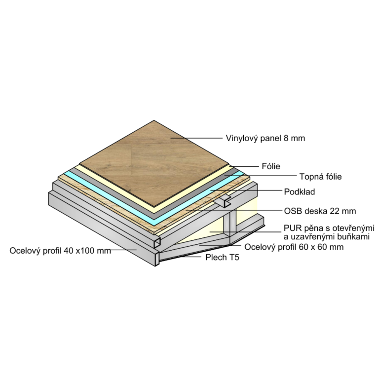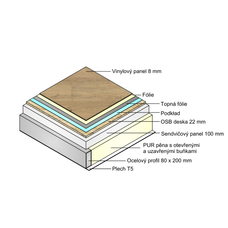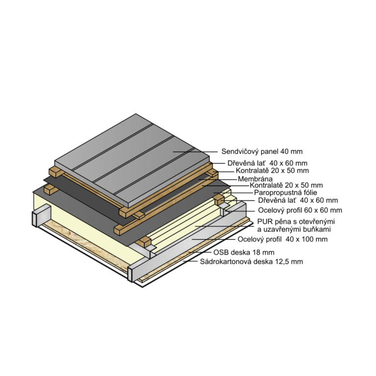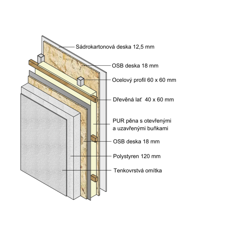 Níže představujeme průřezy stěn, střechy a podlah v mobilních domech a ekodomech a také ukazujeme video z testu vzduchotěsnosti. Protože stavíme domy na zakázku, můžeme konstrukční prvky (např. tloušťku vrstvy PUR pěny, tloušťku stěny) přizpůsobit vašim potřebám.