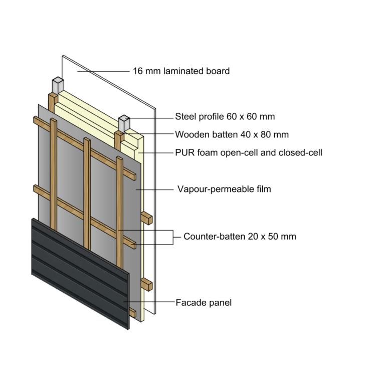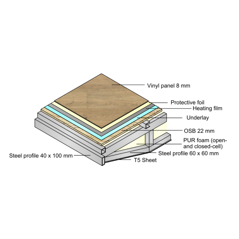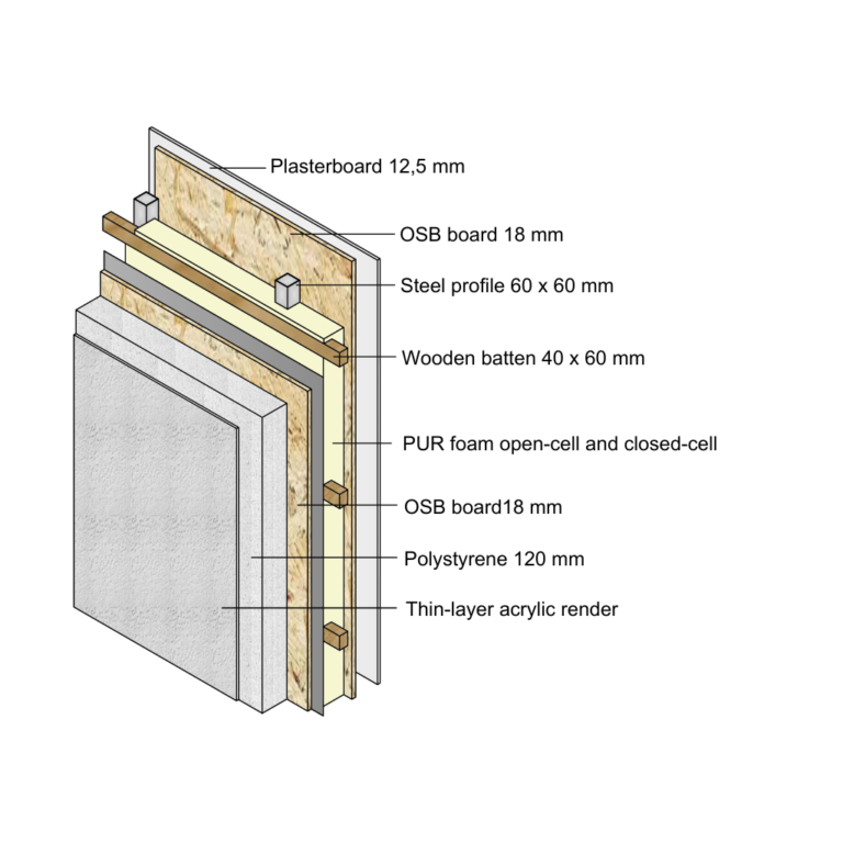 Below, we present cross-sections of the walls, roof, and floors in our mobile homes and eco-houses, along with a video of the airtightness test. Since we build homes to order, we can adjust structural elements (e.g., the thickness of the PUR foam layer, wall thickness) according to your needs.