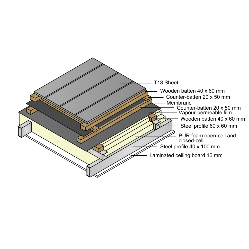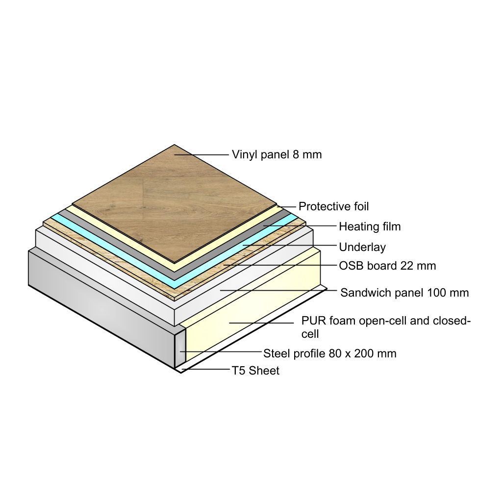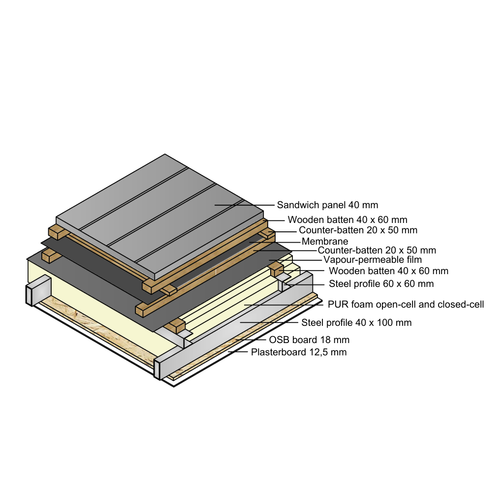 Below, we present cross-sections of the walls, roof, and floors in our mobile homes and eco-houses, along with a video of the airtightness test. Since we build homes to order, we can adjust structural elements (e.g., the thickness of the PUR foam layer, wall thickness) according to your needs.